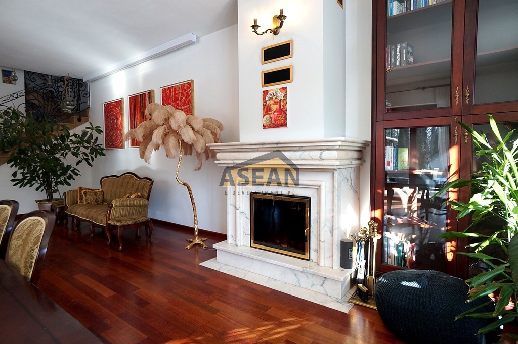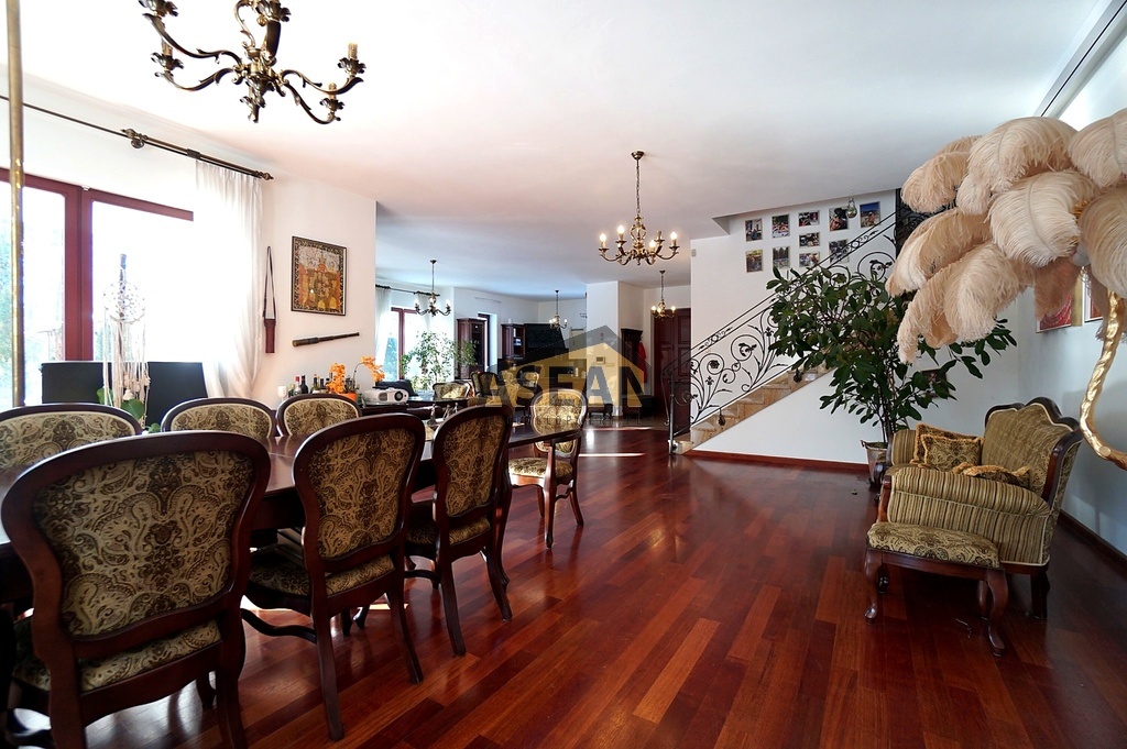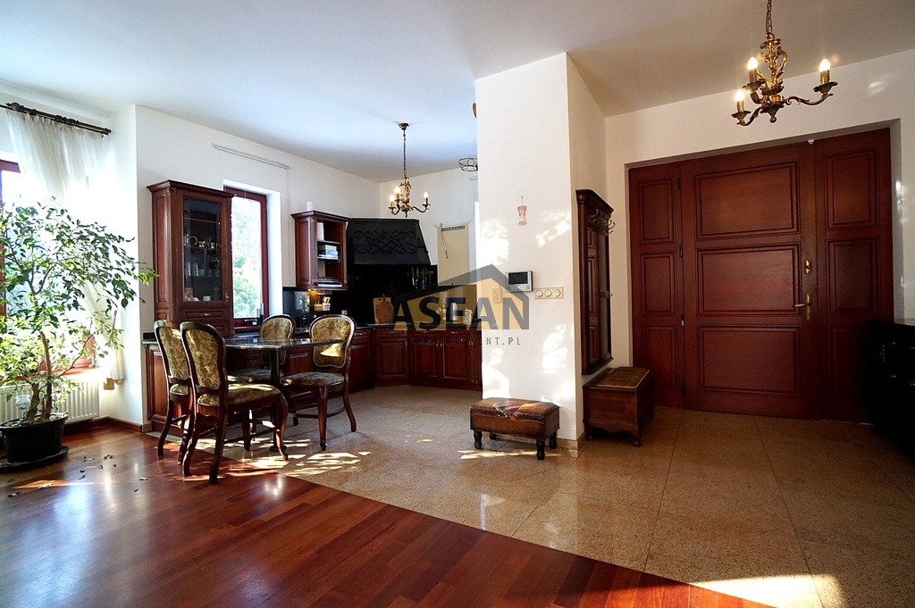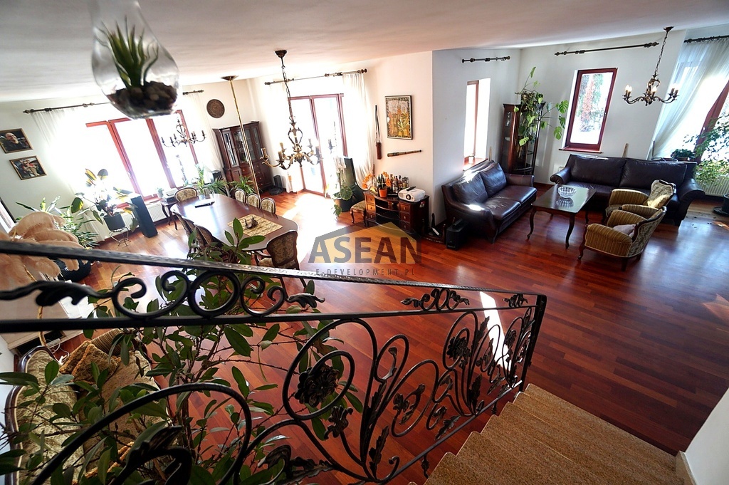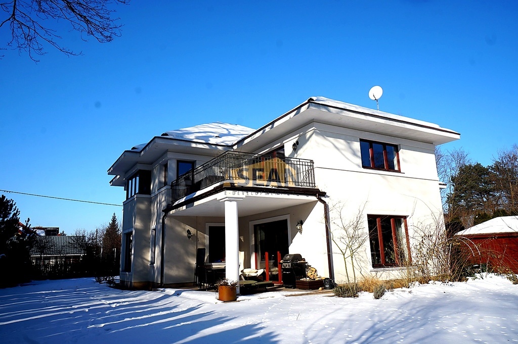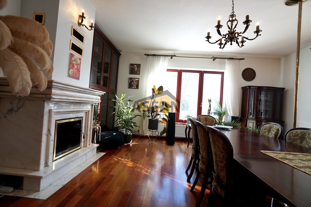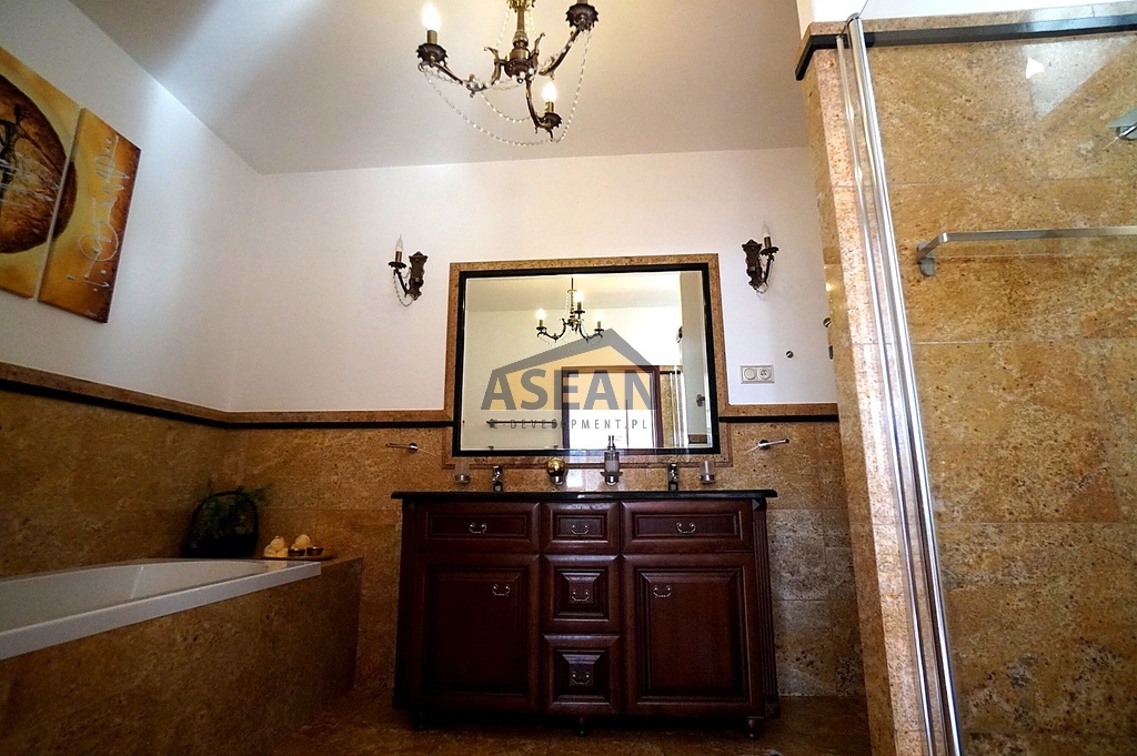 Na sprzedaż rezydencja - dom wolnostojący w Magdalence, wybudowany w 2010 r., wykończony w późniejszych latach w wysokim standardzie. Powierzchnia domu 265 m2 + garaż (łączna powierzchnia z garażem 305 m2). Powierzchnia działki 1000 m2, ogród zaprojektowany przez znanego projektanta, z egzotycznymi roślinami, na działce dodatkowo naziemny basen (na podbudowie betonowym)na słoną wodę, oświetlenie zewnętrzne w 2 systemach punktowy pod drzewkami oraz naziemne przy krzewach ogrodowych. Media woda miejska, kanalizacja miejska, ogrzewanie na piec gazowy. Na podłodze wysokiej jakości drewno egzotyczne, okna i drzwi również z drewna egzotycznego. Meble wykonane na wymiar z litego dębu. W salonie kominek z marmuru, kino domowe. Ogrzewanie podłogowe. Elementy kute w domu wykonane na zamówienie przez zawodowego kowala. Parter garaż w bryle domu na 2 auta, z kotłownią. Obszerny open space złożony z salonu (z kominkiem i wyjściem na tara, z kinem domowym), część wypoczynkowa, aneks jadalny oraz kuchnia otwarta. Pralnia z suszarnią, WC. Półpiętro duży pokój (może być wykorzystany na gabinet, sypialnię - w chwili obecnej wykorzystywany jako pokój saunowy - zamontowana sauna sucha. Piętro Master bedroom z wyjściem na duży taras, łazienka małżeńska (z wanną i kabiną prysznicową), 2 duże pokoje (jeden wykorzystywany jako zabudowana garderoba, drugi jako gabinet z sypialnią), łazienka ogólna (różowy marmur, z wanną i kabiną prysznicową).