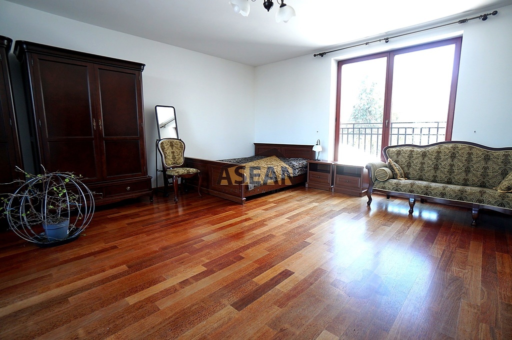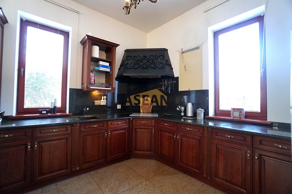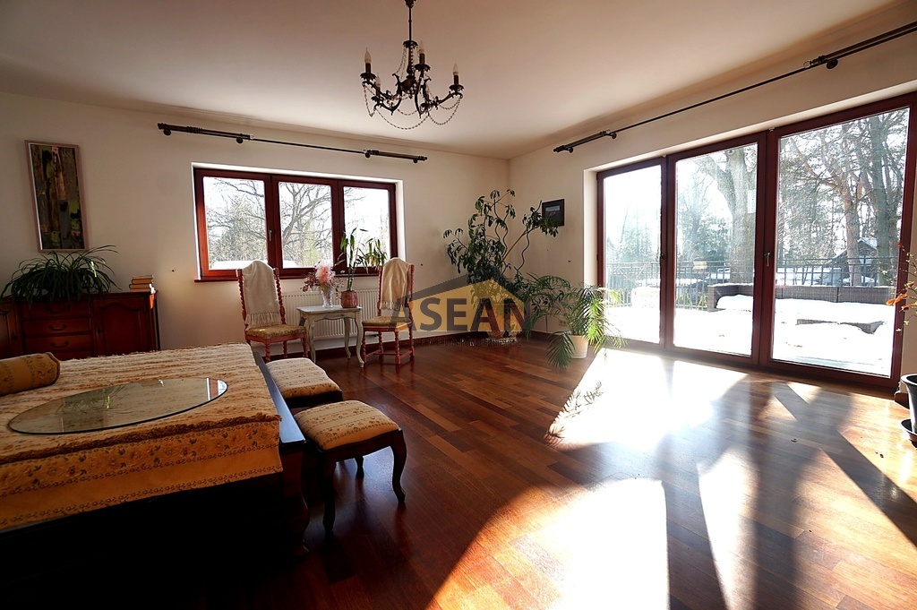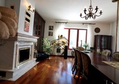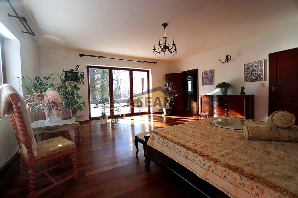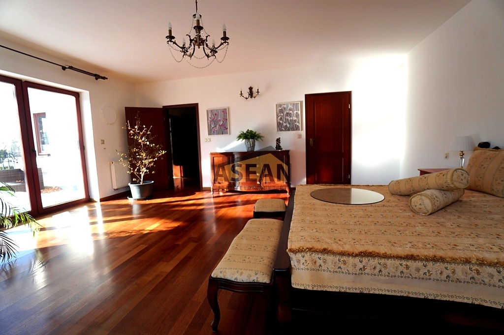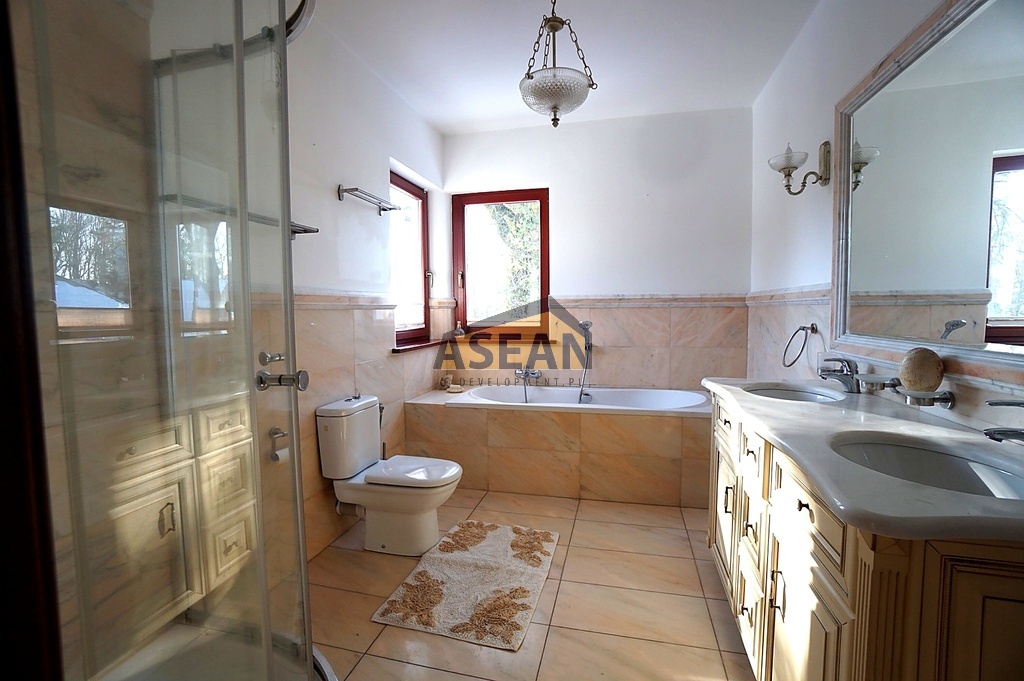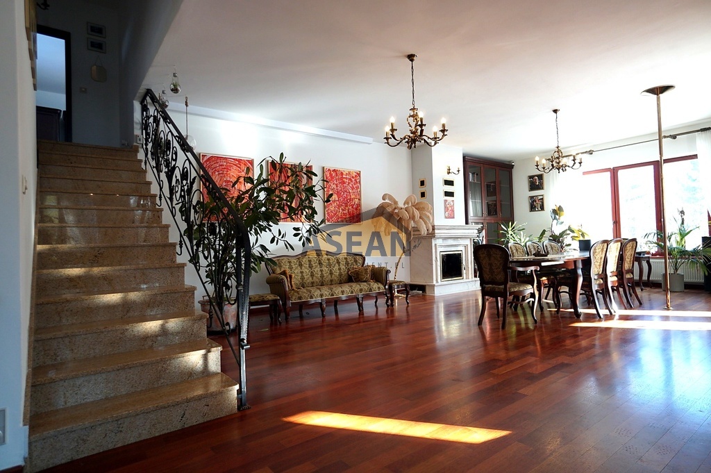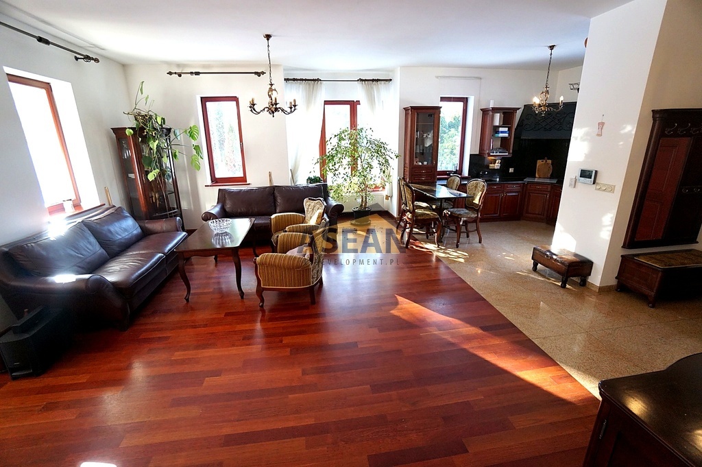 Na sprzedaż rezydencja - dom wolnostojący w Magdalence, wybudowany w 2010 r., wykończony w późniejszych latach w wysokim standardzie. Powierzchnia domu 265 m2 + garaż (łączna powierzchnia z garażem 305 m2). Powierzchnia działki 1000 m2, ogród zaprojektowany przez znanego projektanta, z egzotycznymi roślinami, na działce dodatkowo naziemny basen (na podbudowie betonowym)na słoną wodę, oświetlenie zewnętrzne w 2 systemach punktowy pod drzewkami oraz naziemne przy krzewach ogrodowych. Media woda miejska, kanalizacja miejska, ogrzewanie na piec gazowy. Na podłodze wysokiej jakości drewno egzotyczne, okna i drzwi również z drewna egzotycznego. Meble wykonane na wymiar z litego dębu. W salonie kominek z marmuru, kino domowe. Ogrzewanie podłogowe. Elementy kute w domu wykonane na zamówienie przez zawodowego kowala. Parter garaż w bryle domu na 2 auta, z kotłownią. Obszerny open space złożony z salonu (z kominkiem i wyjściem na tara, z kinem domowym), część wypoczynkowa, aneks jadalny oraz kuchnia otwarta. Pralnia z suszarnią, WC. Półpiętro duży pokój (może być wykorzystany na gabinet, sypialnię - w chwili obecnej wykorzystywany jako pokój saunowy - zamontowana sauna sucha. Piętro Master bedroom z wyjściem na duży taras, łazienka małżeńska (z wanną i kabiną prysznicową), 2 duże pokoje (jeden wykorzystywany jako zabudowana garderoba, drugi jako gabinet z sypialnią), łazienka ogólna (różowy marmur, z wanną i kabiną prysznicową).